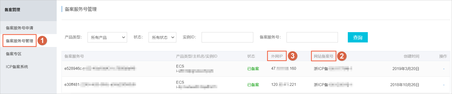 填写网站信息中的ip信息 因各个省市的规则不同,在填写网站信息环节,填写ip的时候,您需要先自行咨询网安部门后再填写。如果网安部门告知您可以填写备案服务器的ip地址,您可以使用购买阿里云服务器的账号登录备案控制台,在备案服务号管理中查看网站备案号,找到您的网站备案号对应的外网ip,此外网ip即备案服务器ip。备案服务器ip
